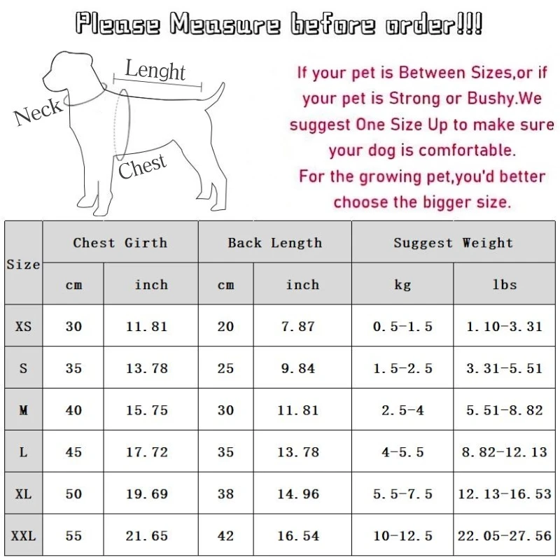XXL: Chest 55cm/21.65'' ; Length 42cm/16.54'' ; Suggest Weight 10-12.5 kg/22.05-27.56 lbs.
